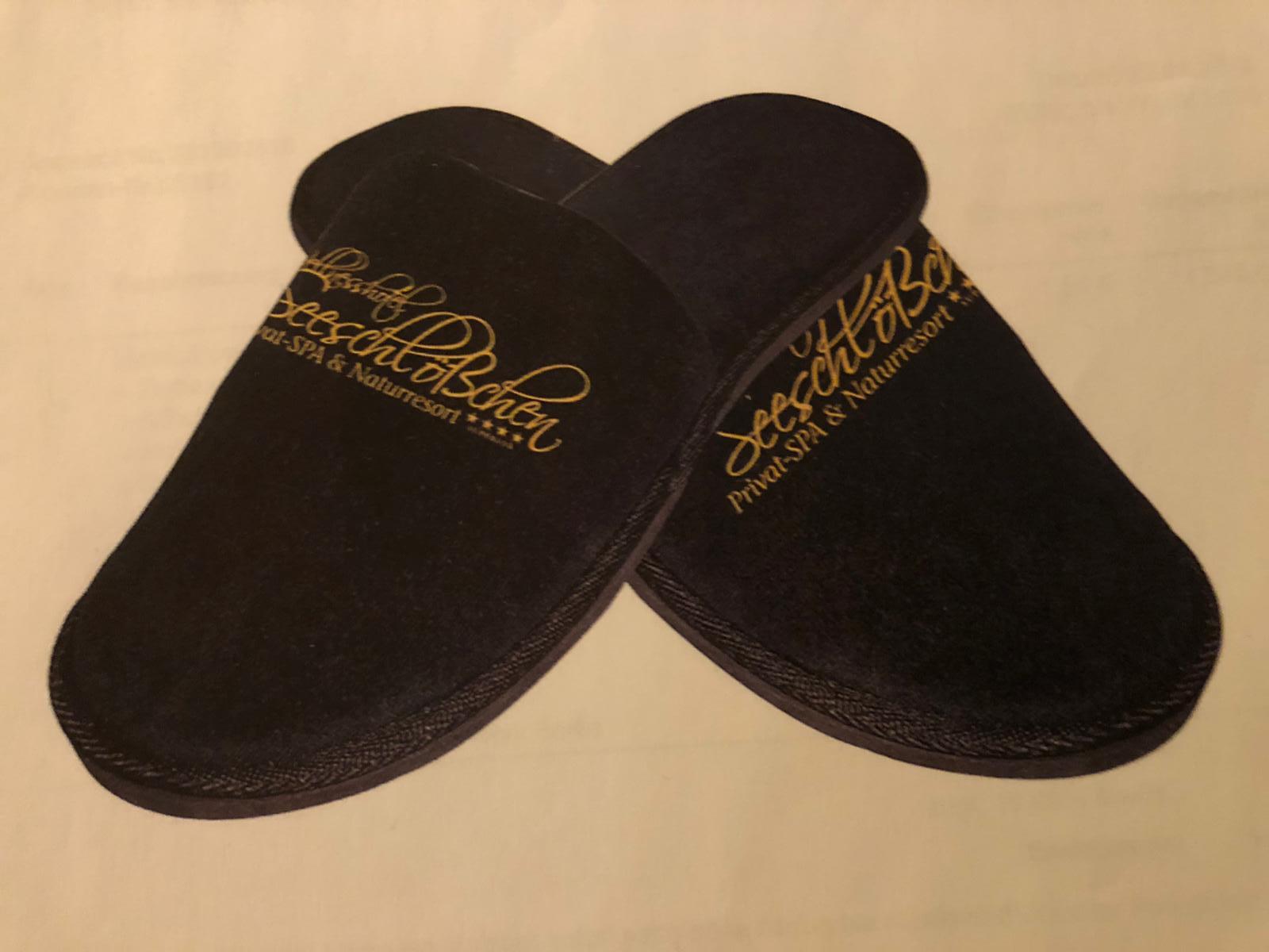 - Sie finden samtweiche Badeslipper mit Schlösschen-Logo im Wellness-Set.